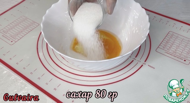 В другой миске взбиваем яйца, сахар и щепотку соли.