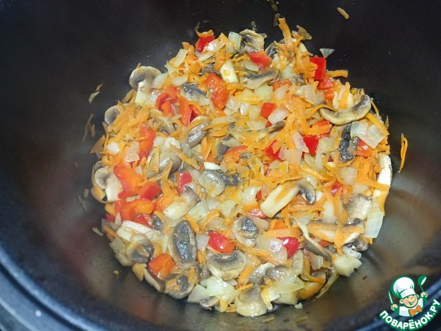 Отправляем в чашу масло, лук, перец, морковь и грибы — Режим «Жарка» 12 минут (Не забываем перемешивать каждые 2-3 минуты)