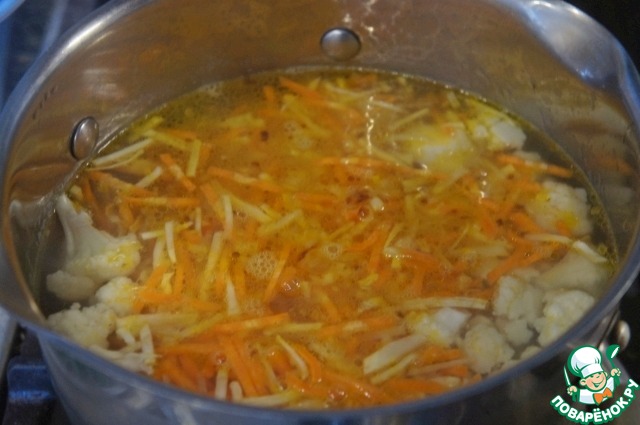 Добавить зажарку и цветную капусту и снова варить после закипания 5 минут.