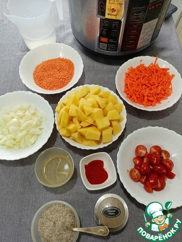 • Добавляем паприку и чечевицу — Режим «Крупы» 25 минут.