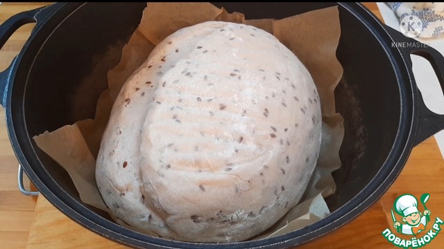 Выкладываем заготовку в раскалённую кастрюлю, накрываем крышкой. Выпекаем 10 минут при 240⁰С под крышкой.