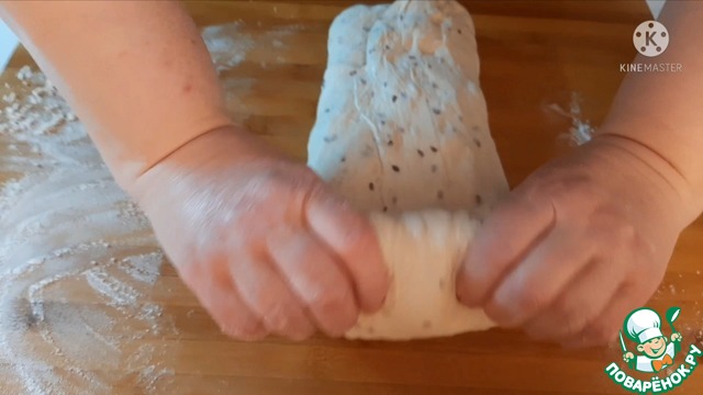 Тесто увеличится в два раза. Выкладываем на стол припыленной мукой. Немного растягиваем и формируем хлеб.