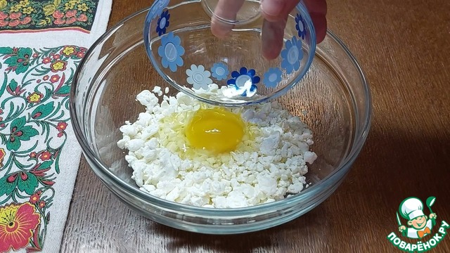 Все необходимые ингредиенты должны быть комнатной температуры. К 170 г творога (5% жирности и более ) добавляем 1 яйцо и 1/3 ч. л. соли. Измельчаем всё блендером до однородной массы.