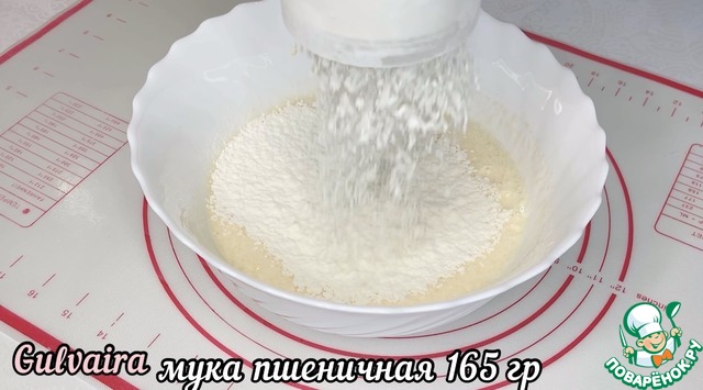 Добавляем просеянную муку и разрыхлитель. Перемешиваем до однородной массы.