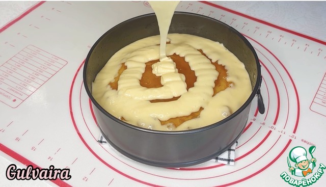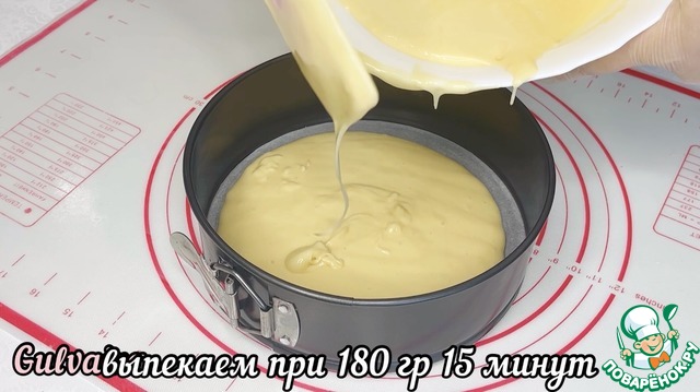 Половину теста выкладываем в форму для запекания, и выпекаем в заранее разогретой духовке при 180 гр 15 минут.