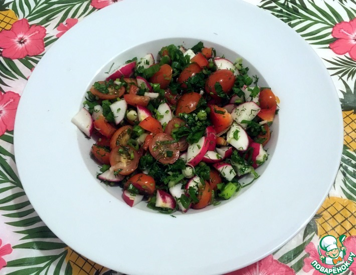 Предлагаю приготовить весенний салатик с помидорчиками, перчиком, редисом, зеленью и ароматными специями. Особенно пригодится тем, кто не очень любит листья кинзы в салатах, но вкус зерен кориандра одобряет.