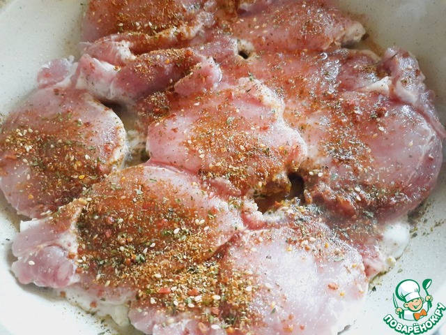 Нарежьте мясо кусочками толщиной 1,5-2 см и обжарьте на сковороде с растительным маслом на сильном огне. Посолите, щедро приправьте приправой с паприкой и кориандром. Переверните, снова посолите и приправьте. Жарьте 5 минут.