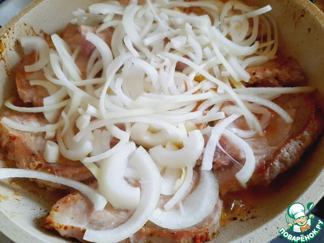Нарежьте лук полукольцами. Добавьте к мясу. Подержите 3 минуты, переверните мясо и жарьте все вместе еще 5 минут.