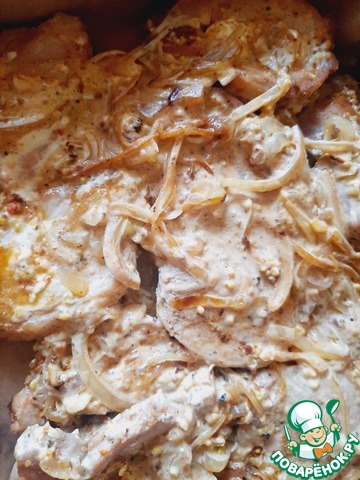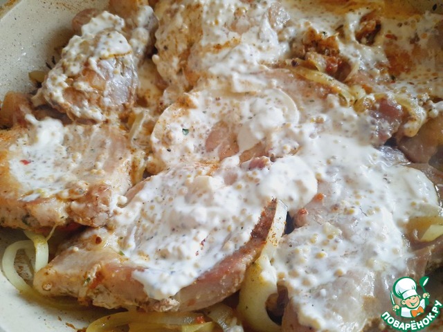 Смажьте мясо сверху смесью сметаны и горчицы. Снимите с огня.