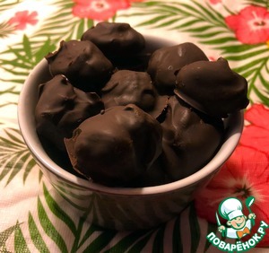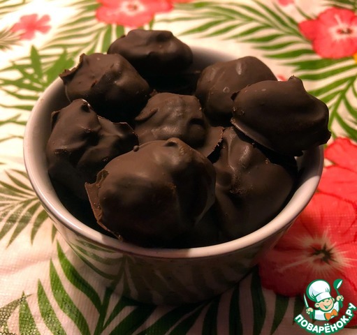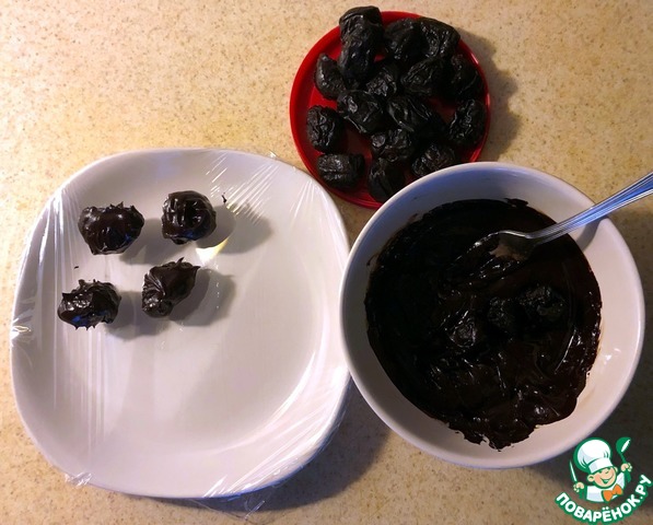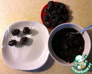 Примечание: если чернослив мелкий, то можно использовать 2 чернослива для фарширования 1 миндаля. Конструкция будет хорошо держать форму после застывания шоколада.