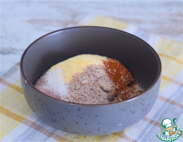 Фарш (у меня куриный, вы можете взять любой мясной или птичий фарш) смешать с отрубями, манкой (кукурузной), приправить паприкой (если это будет паприка копченая - отлично!), чесночным порошком и немного посолить.