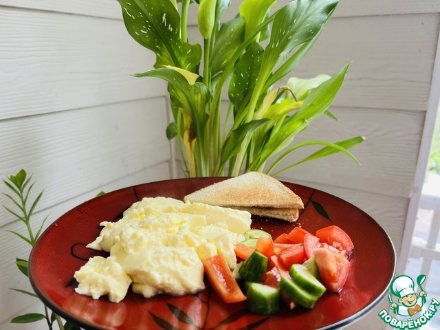 Предлагаю попробовать омлет. Благодаря, на мой взгляд, очень замечательным пропорциям, получается всегда и на воде, и на молоке, и при любом количестве яиц.