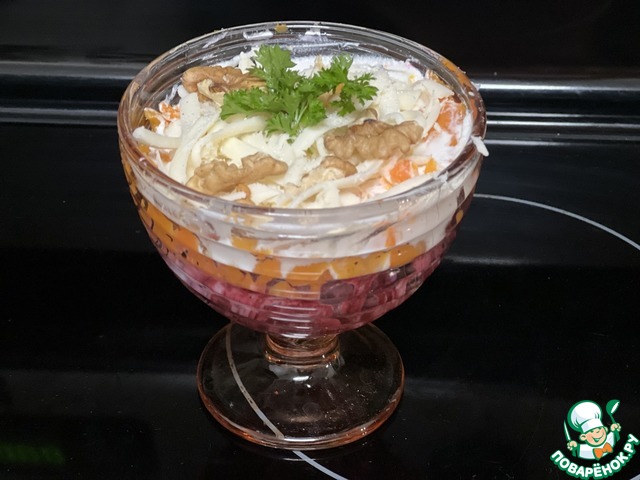 Салат готов! Его можно сразу подавать к столу. Для праздничного стола я готовлю слоями, если вам не на выставку, то можно просто все перемешать