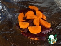 Фольгу смазать маслом, подушкой уложить свеклу и морковь.