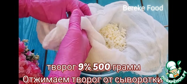- Творог (9% творог. Отжимаем обязательно через 4 слоя марли или через платочек х/б.) — 500 г