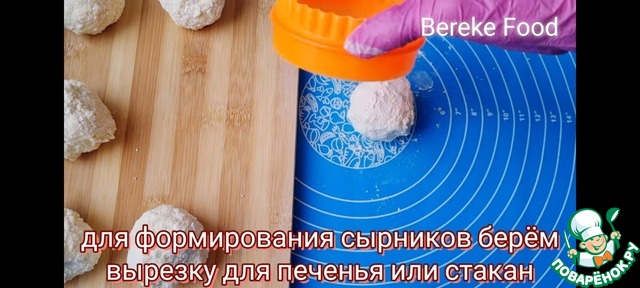 Далее шарики обваливаем в муке со всех сторон и с помощью стеклянного стакана или вырезки для печенья формируем сырники как показано на видео.