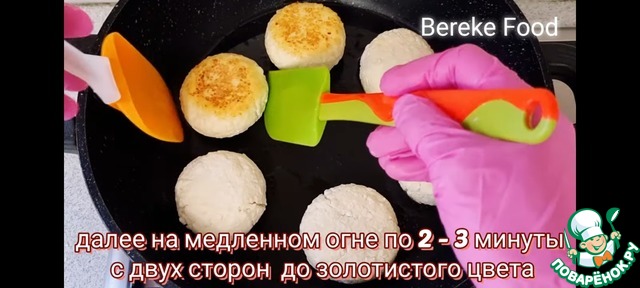 Жарим в хорошо разогретой сковороде на не большом количестве растительного масла, сначала с двух сторон на сильном огне до золотистого цвета, а далее с двух сторон по 2 - 3 минуты на медленном огне. По желанию можно на этом этапе закрыть крышкой.