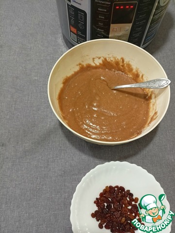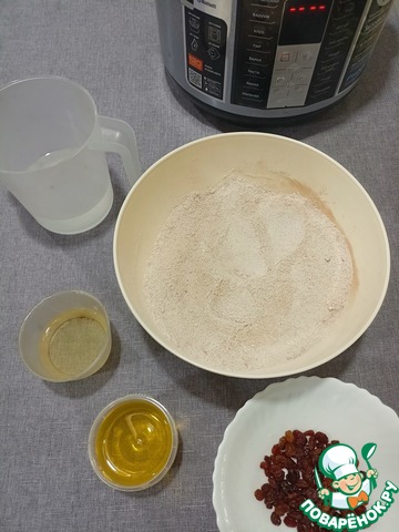 Смазываем кисточкой дно и низ бортов чаши маслом. Далее продолжаем готовить тесто: Добавляем воду, масло и мед — Тщательно перемешиваем. После чего добавляем изюм, еще раз перемешиваем.