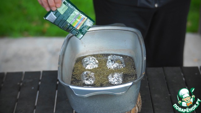 В жаровню укладываем сырой неочищенный картофель, предварительно завернутый в фольгу. Наливаем воды с таким расчетом, чтобы она доходила до середины картофелин. Дальше в воду добавляем специи по желанию (в этом рецепте использовалась смесь прованских трав).