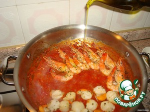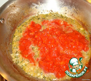 Затем вынуть морепродукты на тарелочку, а в сковороду налить вино, дать покипеть пару минут и добавить домашний томат или измельчённые помидоры (можно также использовать помидоры в собственном соку), если помидорки свежие, дать покипеть, пока жидкость не испарится наполовину, а если томат, то достаточно минут 5, постоянно помешивая
