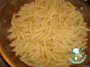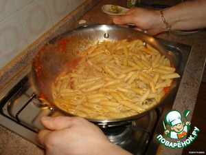 Отварить макароны в большом количестве подсоленной воды строго по времени, указанном на упаковке, они ни в коем случае не должны быть переваренными...