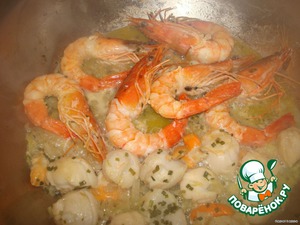 добавить морепродукты и измельчённую петрушку, протушить минут 5, переворачивая с одного бочка на другой креветки и гребешки -