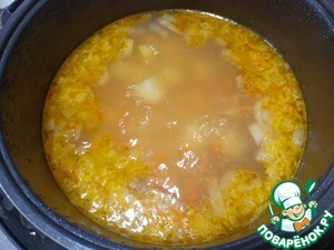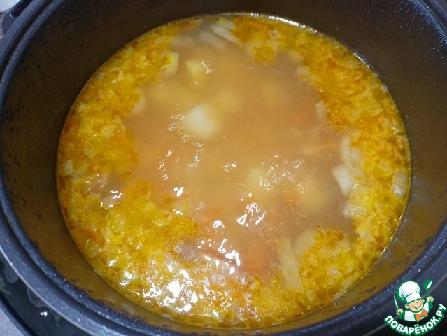 Добавляем в чашу воду (горячую), горох, перец и картофель - Режим «Тушение» 60 минут.