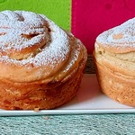 4. Со второй частью теста проделываю почти тоже самое, только вместо изюма посыпаю сахарной пудрой. Рулет разрезаю на 2 отдельные части, каждую часть сворачиваю спиралькой вверх.