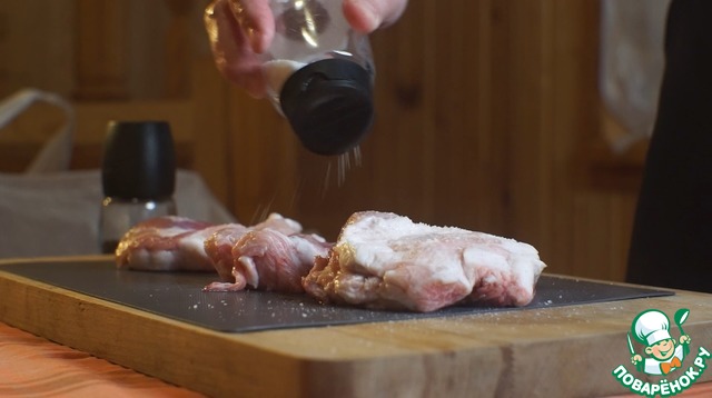 Свинину разделить на стейки размером около 300 грамм. Обсыпать мясо специями.
