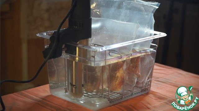 Настроить сувид-циркулятор на приготовление при температуре 69 градусов в течение 4 часов. Возможно также использовать мультиварку, если ее можно настроить на этот режим.