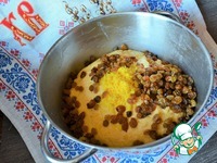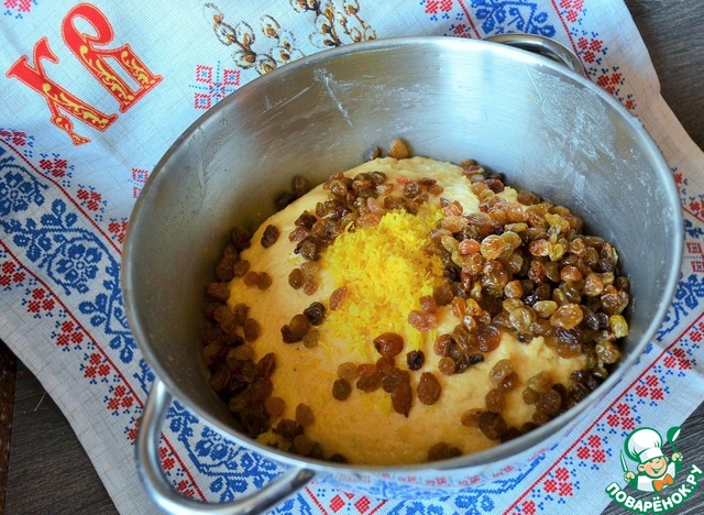В тесто добавить изюм и цедру, ещё раз вымесить до однородности. Накрыть и вновь убрать на 30-45 минут в тёплое место.