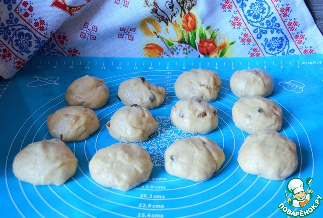 Выбродившее тесто обмять, выпекать мазанец можно одним большим или маленькими. Для этого тесто разделить на кусочки по 70-75 г.. Подкатать в колобки.