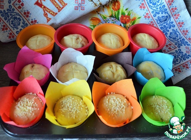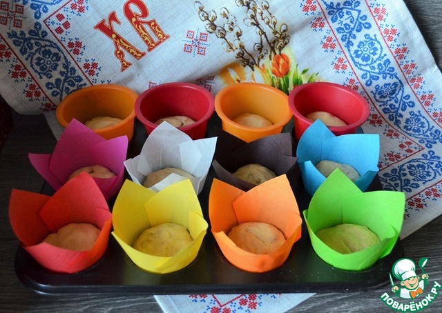 Разложить колобки по формам. Накрыть плёнкой и оставить ещё на 30-45 минут.