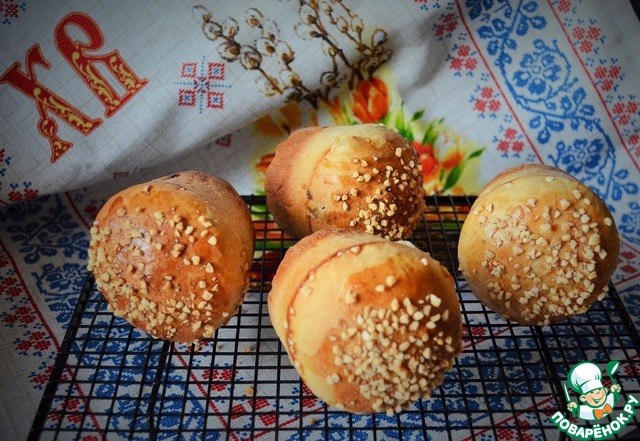 Расстоявшиеся заготовки аккуратно надсечь крестом, смазать смесью желтка и молока и присыпать рубленым миндалём.