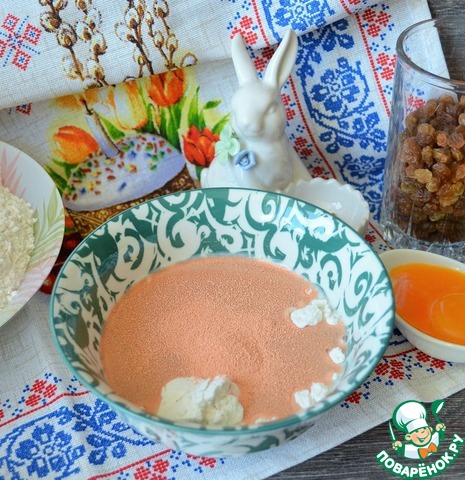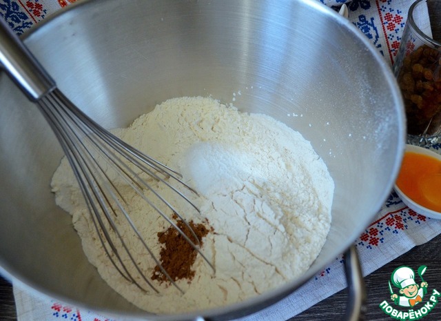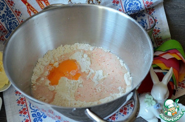 Добавить к сухой смеси желтки и опару. Замесить тесто, накрыть и оставить в тёплом месте на 20 минут.