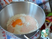 Из общего количества взять 1ст. л. сахара и 1 ст. л. муки, добавить тёплую воду и дрожжи. Смешать, накрыть и оставить в тёплом месте на 10-15 минут, для активации дрожжей.
