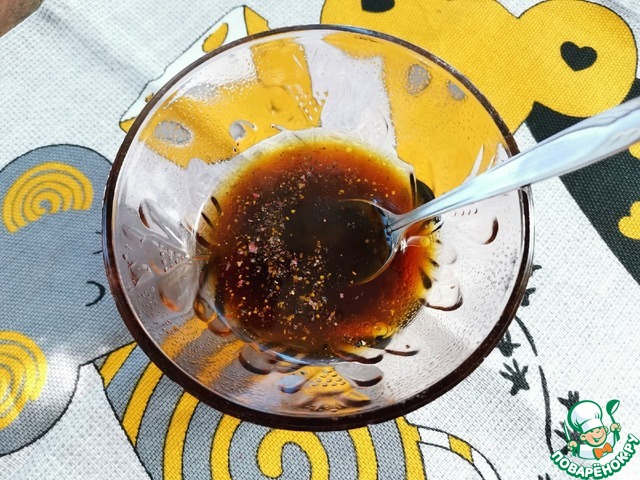 • Перемешать все ингредиенты для заправки: яблочный уксус, соевый соус, мёд, оливковое масло (или любое растительное) и чёрный свежемолотый перец.
