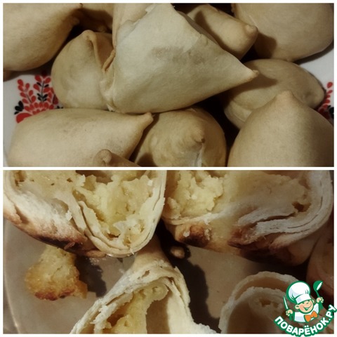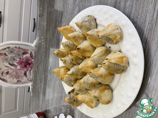 Маленькие закусочные пирожки из тонкого бездрожжевого теста, в них много начинки и мало теста. Готовятся очень быстро. Тесто получается хрустящим, слоистым и очень вкусным.