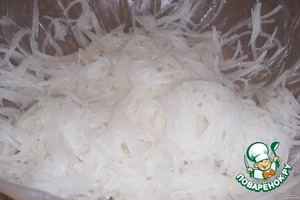 Дайкон натереть на тёрке для корейской моркови, посолить и оставить на 10 минут.