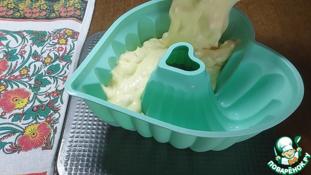 Получившееся тесто перекладываем в форму. У меня она силиконовая. Объёмом около 1 литра. Смазала её растительным масло, т. к. использую впервые.