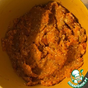 7. Смешиваем мясной фарш с морковным жмыхом, остывшим рисом, яйцами, специями и солью.