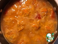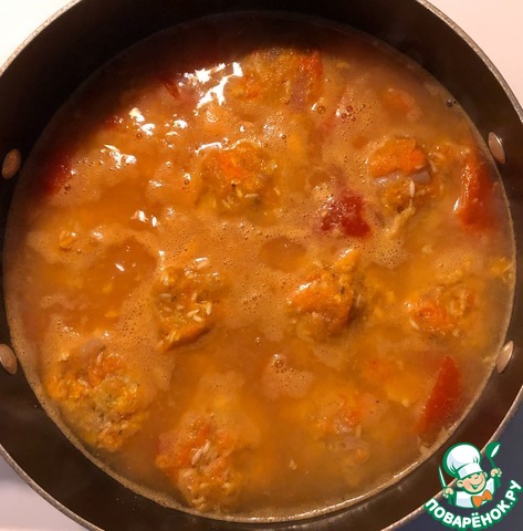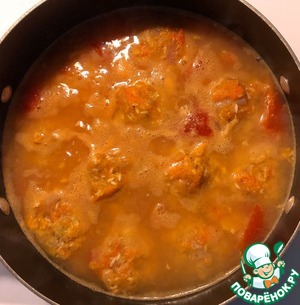 9. Укладываем тефтели в томатный бульон и добавляем кипяток, чтобы бульон покрывал тефтели.