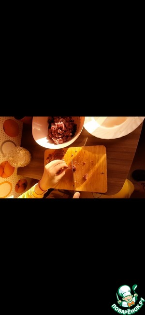 Нарезаем мясо на маленькие кусочки, заранее порезал зелень
