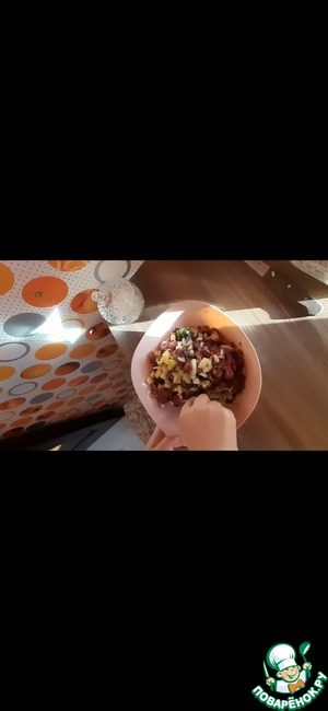 Мясо, картофель и лук складываем в одну миску, тщательно перемешиваем и добавляем соль и перец по вкусу