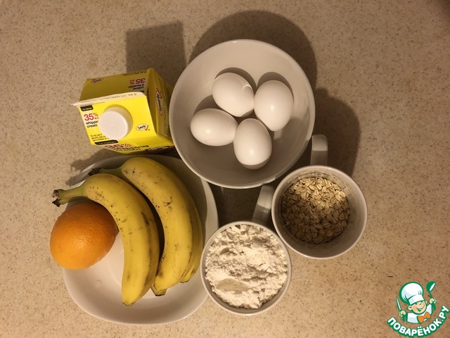 Всем любителям бананов посвящается этот рецепт. Вместо масла используются сливки, а вместо сахара - сладость спелых бананов. Цедра апельсина и пряности дополняют чудесный аромат этой выпечки. Овсянка добавляется в качестве источники клетчатки, а яйца - для сытости.