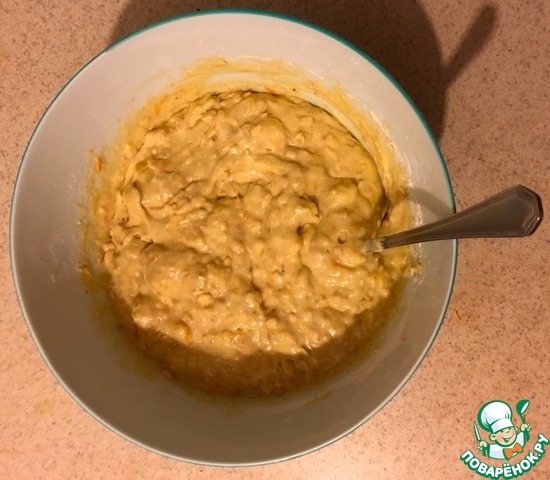 3. Разминаем вилкой бананы, добавив сливки, цедру апельсина и яйца. Взбиваем венчиком или вилкой.