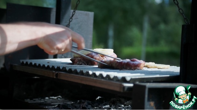 Существует много способов, как ароматизировать мясо без предварительного маринования. В этом рецепте используется техника аргентинских асадоров, когда поверх стейка просто выкладываются фрукты, а в процессе жарки вся конструкция еще дополнительно смазывается фруктовым соком, или, как в нашем случае, сиропом из банки. Поскольку аргентинская школа предусматривает достаточно длительное приготовление на не сильном жаре, мясо успевает полностью пропитаться соком и взять в себя аромат фруктов. Ну, а в качестве бонуса сами фрукты обжариваются на решетке и подаются на гарнир.