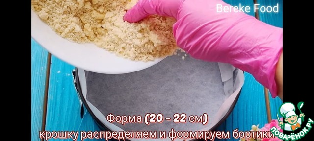 В муку добавляем сахар, разрыхлитель, соль, ванилин хорошо перемешиваем венчиком. Далее добавляем масло и делаем крошку. Крошку немного оставляем для верхнего слоя. Форму застелаем пергаментом высыпаем крошку распределяем по форме и делаем бортики. Затем отправляем в холодильник на 10 минут.