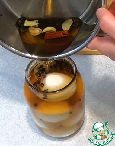 Очистить вареные яйца и уложить в литровую банку. Залить яйца остывшим маринадом. Закрыть банку крышкой и поставить в холодильник на 3 дня.
