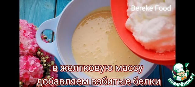 В отдельной чаше белки взбиваем пару минут, далее кладу соль и взбиваю до плотных пиков. Теперь в желтковую массу добавляю белки и аккуратно перемешиваю